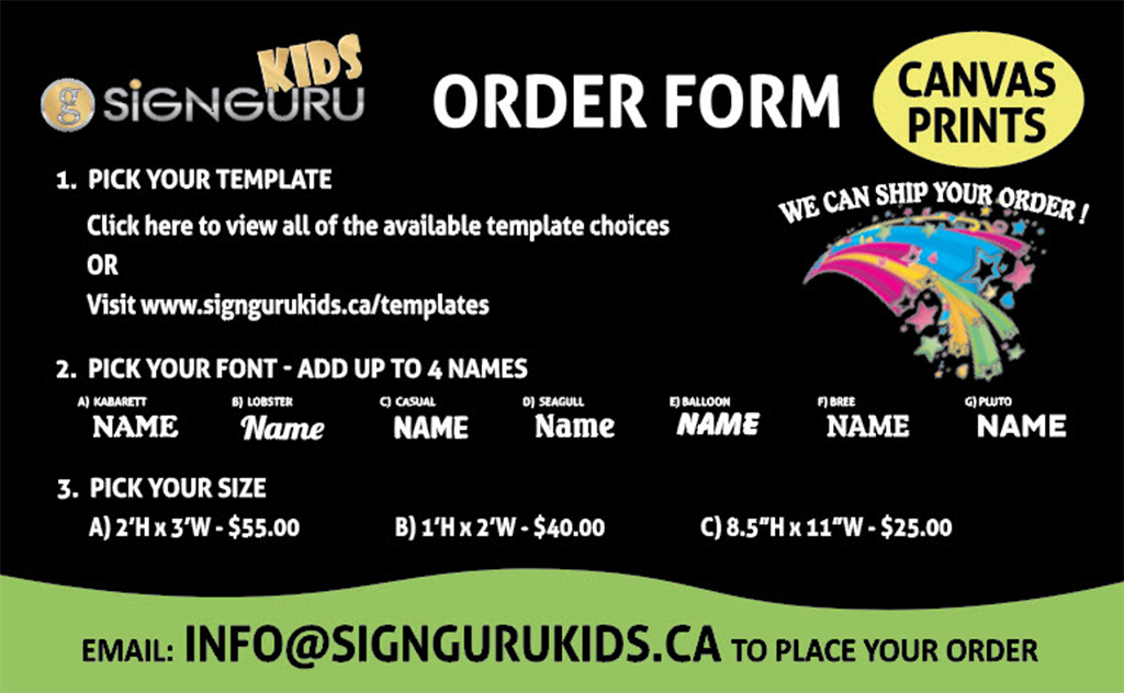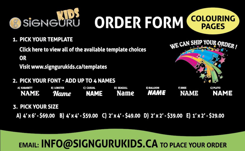 Sign Guru Kids has pre-set designs, sizes and prices to make your transaction simple and easy! Email your preferences to info@signguru.ca.